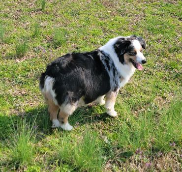 Daisy is a harlequin blue Merle with a blue eye and a blue marbled eye. Daisy has a very happy-go-lucky willing to please temperament.